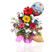 ¡Celebra a lo grande! Este colorido arreglo es una fiesta en sí misma. Combina la frescura de gerberas multicolores y claveles blancos con una selección de tus snacks favoritos (KitKat, chocolates y más). Coronado con un globo de "Feliz Cumpleaños", es el detalle perfecto para enviar amor y alegría directamente a su puerta. Un regalo dinámico y delicioso diseñado para ser el centro de atenci